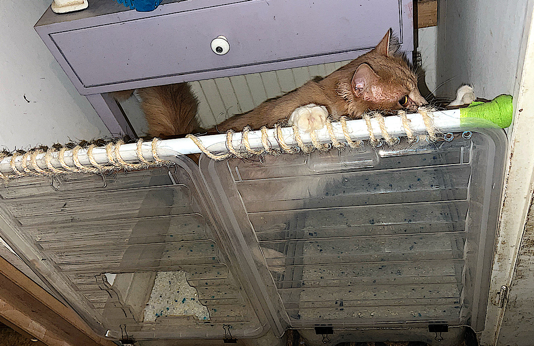 Fru Mulle Meck har vart i farten igen. Denna gång är det en barriär mellan hundarna och kattlådan. Jag personligen tycker det är äckligt att hundarna äter bajset men förstår ändå varför de gör det. Anledningen till att hundar är mer eller mindre galna i avföring från katt är enkelt, det innehåller fortfarande en massa näring då katter, precis som oss människor. Vi är väldigt dåliga på att tillhandahålla allt vi äter och kan där med släppa igenom upp till 75-80% näring. I en hunds värld är det slöseri! Sen använder jag inte vanlig kattsand, alltså lera, eller annan biologiskt material utan använder silica kristaller, vilket är giftigt att förtära. Med lite skräp material och lite mecklande så är kattens lådor skyddade från hundarna.