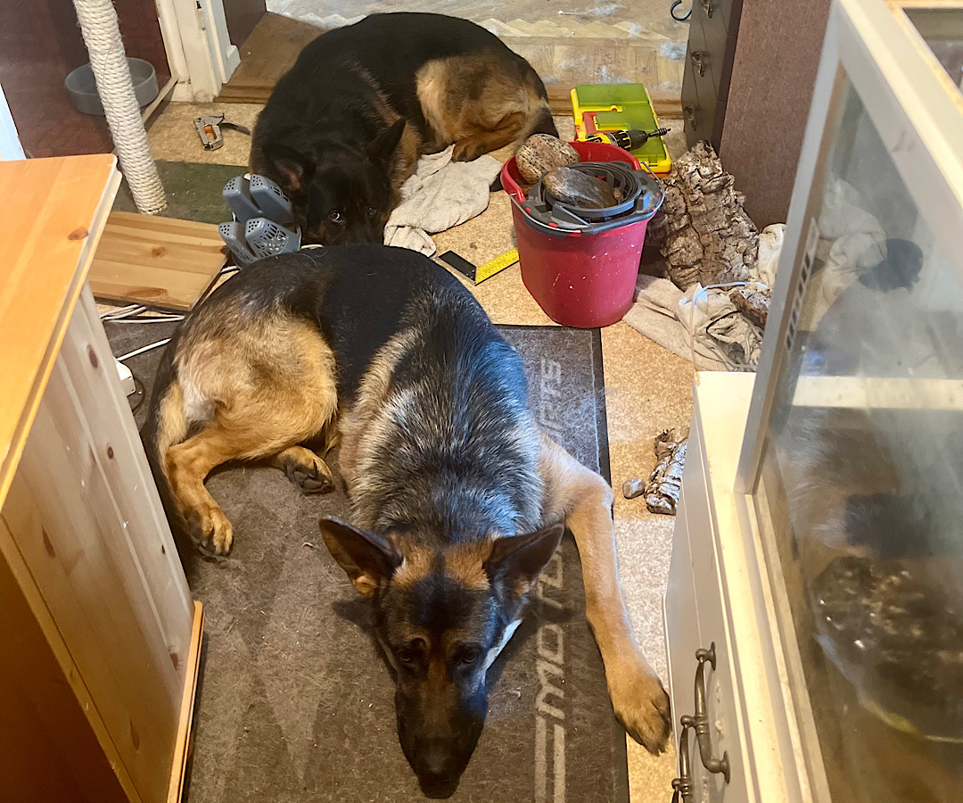 I live in a kindly big apartment with three bedrooms but my hallway is small and long, I have Gundvall and Larsons tank there. The only reason is because it’s closest too the toilet, so I can easily change water. So, what do I see behind me, yes, my “small” GSD boys